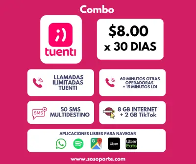 8GB + 60 Min Llamadas ilimitadas entre tuentis + 15 Min LDI + 50 SMS + Gratis WhatsApp y Spotify + Navega gratis (Google Maps, Uber eats, Uber) x 30 días